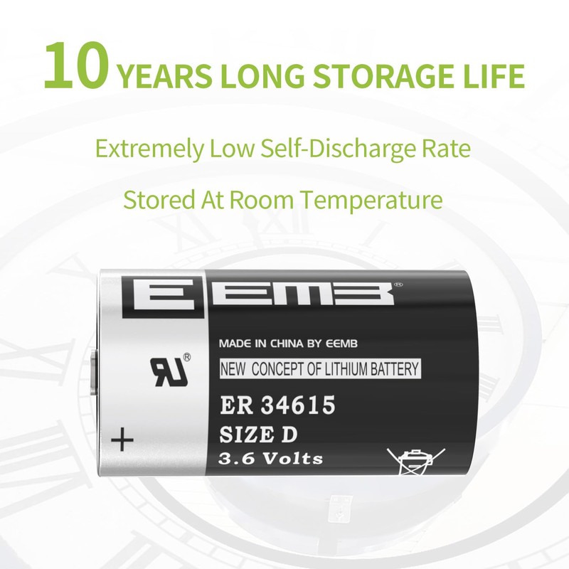 - BASIC INFO—3.6V non-rechargeable d size lithium thionyl chloride battery; 19000 mAh; 33*61.5mm/1.3*2.42 inch, wide range of temperatures -55°C to +85°C; most suitable for low power consumption devices. please check carefully if the ER34615 battery is the size you need for your electronic device before purchasing.