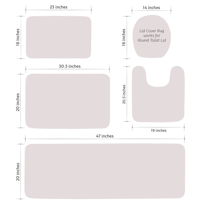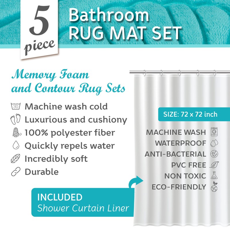 - ONE-STOP SHOPPING: 5 memory foam bathroom rugs (1 Runner Mat 21"x47", 1 Rug 20”x30.5”,1 Rug 17”x24” + 1 Contour Rug 20"x20.5" + 1 toilet lid cover (16"x14") + shower curtain (9 gauge, 72”x72”)