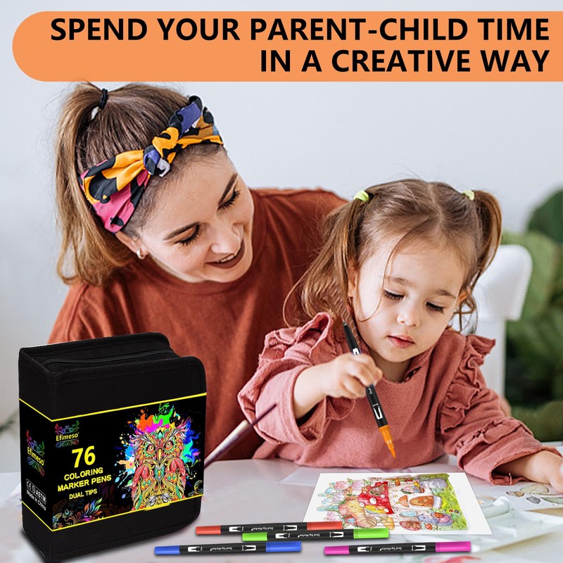 Efimeso 76 Colouring Pens Felt Tip Pens Brush Pens with Case, Dual Tip Coloured Pens Fineliners for Adults Kids Children Colouring Painting Sketching Highlighting Lettering