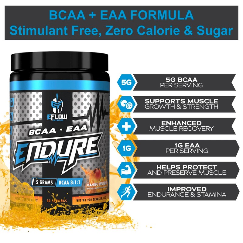eFlow Nutrition eFlow Nutrition Endure BCAA Plus EAA - Essential Amino Acids Electrolyte Powder Intra Workout - Improve Energy, Recovery and Performance - Mango Madness (30 Servings)