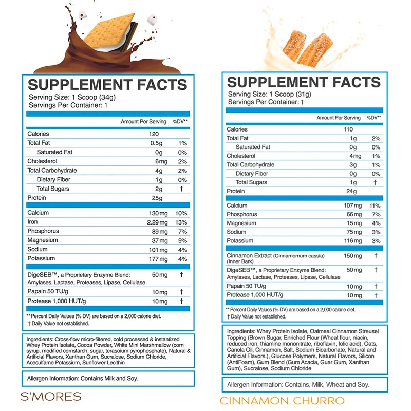 - INCLUDES 8 SINGLE SERVING (2 OF EACH FLAVOR) 100% WHEY PROTEIN ISOLATE SAMPLE PACKS: S'mores, Cinnamon Churro, Birthday Cake, Brownie Batter. (With Real Cereal Pieces!) - Flavors may vary, while supplies last.