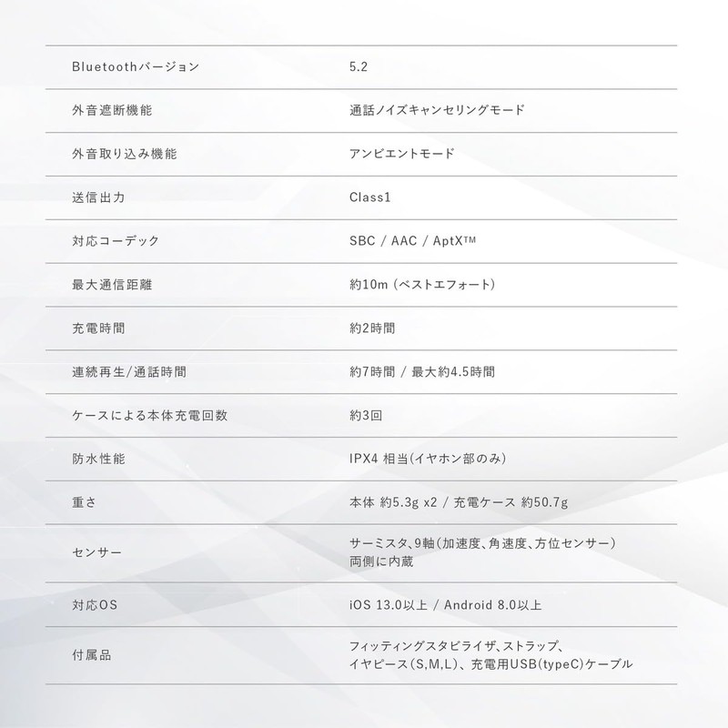 - Waterproof performance: IPX4 equivalent (earphone part only); Weight: Main unit: Approx. 0.2 oz (5.3 g) x 2; Charging case: Approx. 1.8 oz (50.7 g); Sensor: Thermistor, 9 axis (acceleration, angle speed, azimuth sensor). Built in both sides