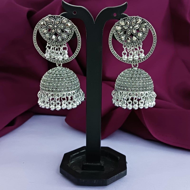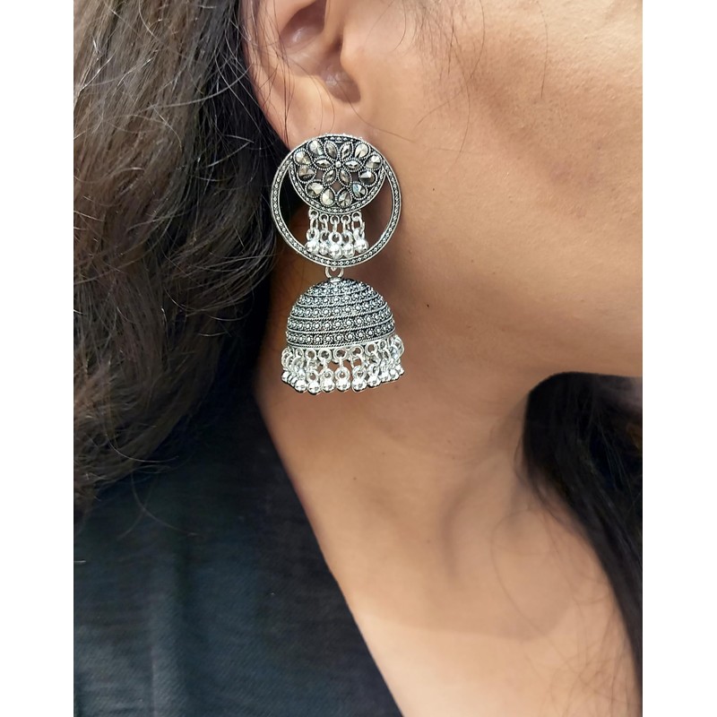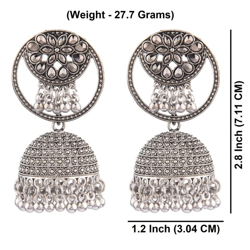 - Oxidized antique silver tone jhumki dangling danglers earrings set, embellished with engraving and carving, crystal, metal balls, big stud earrings jhumka dangle earrings, gives this jewelry set a perfect traditional cum contemporary look.