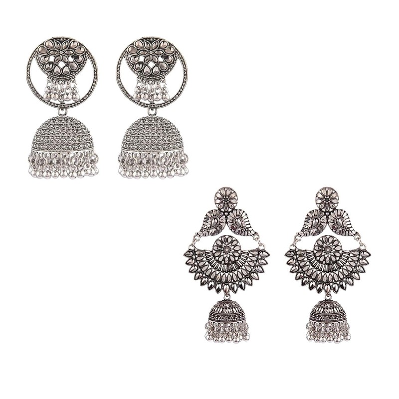 Efulgenz Multipack of 2 Antique Boho Oxidized Indian Earrings for Women Floral Crystal Round Stud Earrings Jhumka Jhumki Earrings Set Indian Oxidized Jewelry Dangle Earrings Bohemian Statement Jewelry, Metal, No Gemstone