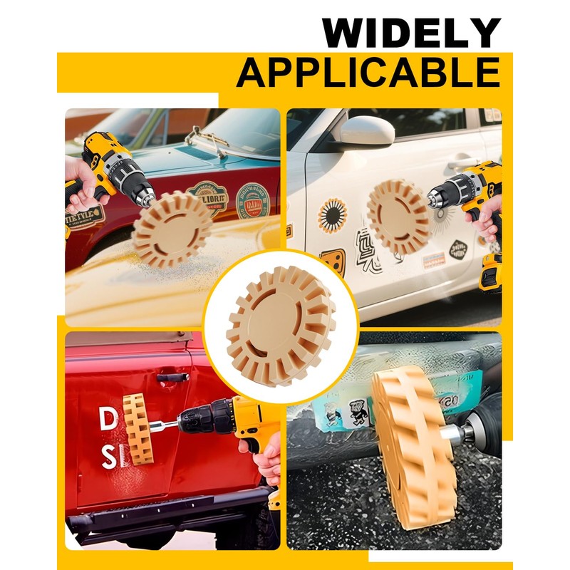 - Widely Used: The Decal remover eraser wheel kit quickly removes decals, tape, and vinyl graphics from cars, boats, trucks, RVs, SUVs, trailers, buses, bikes, motorcycles, etc.; the eraser wheel won't damage the surface