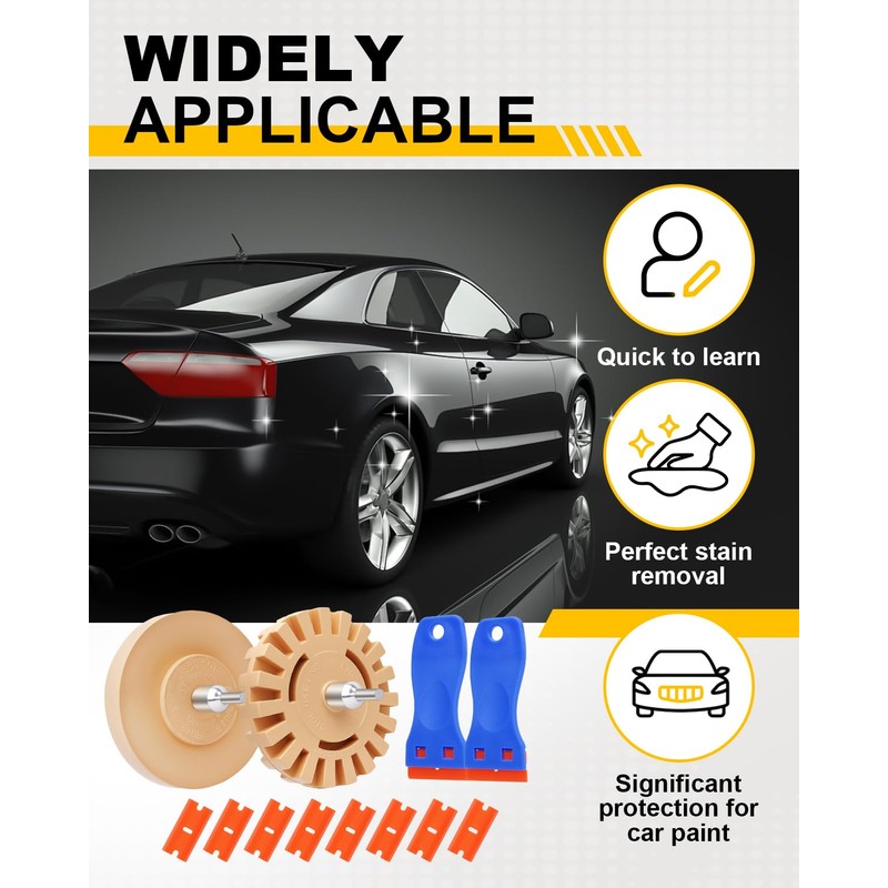 - Multi-functional glue removal tool: This set contains 1 piece of automotive serrated glue adhesive eraser wheel, 1 piece of automotive solid glue removal wheel, , 2 piece of scraper and 8 pieces of plastic blade