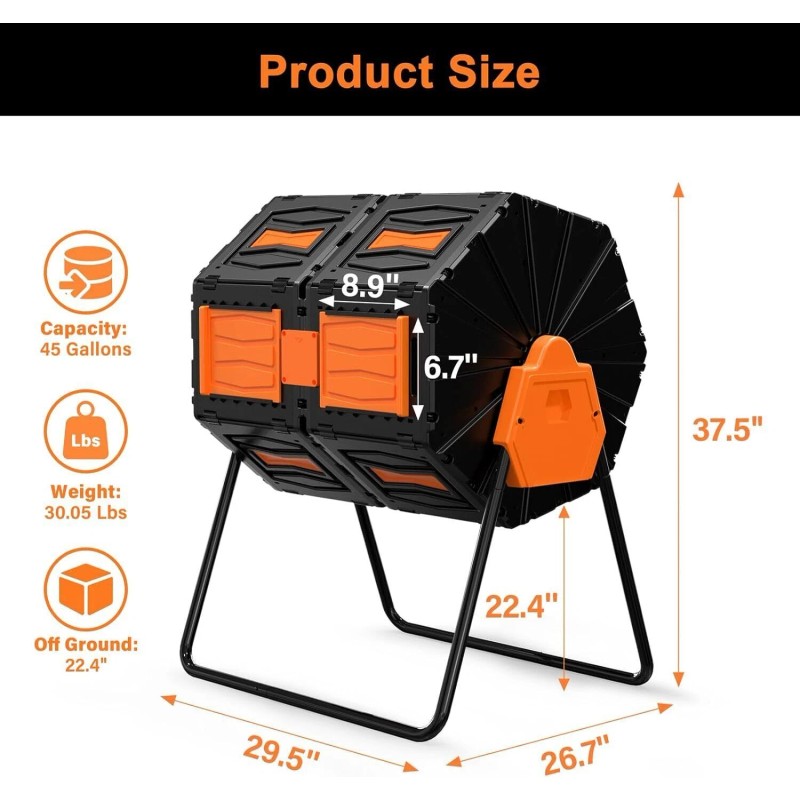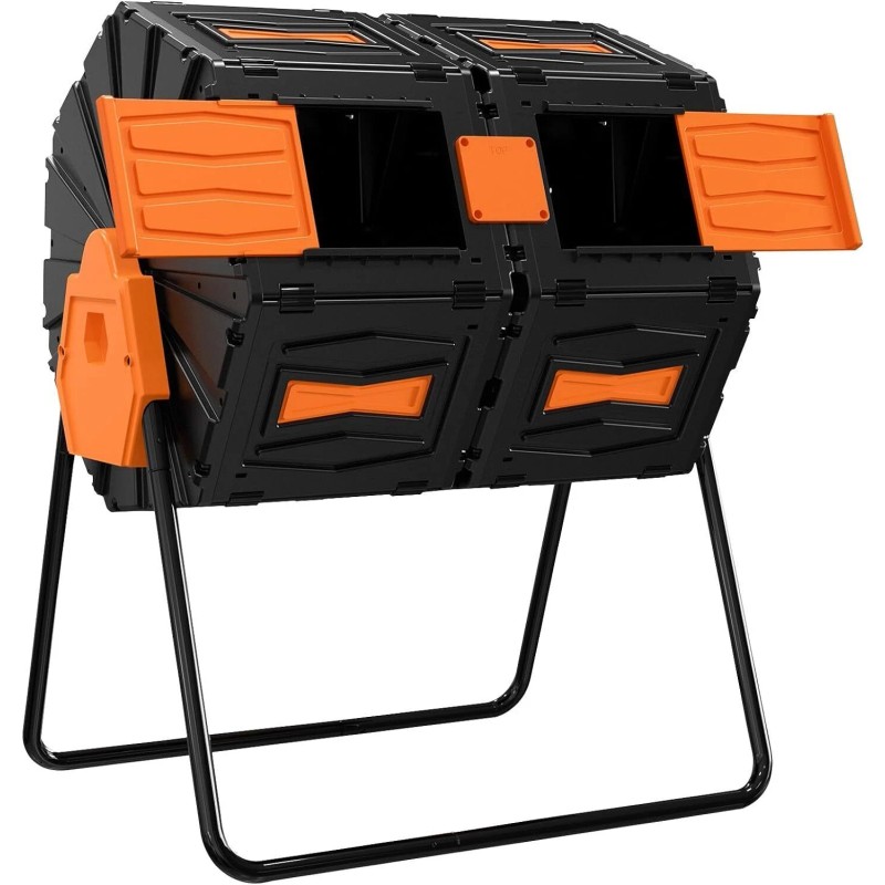 Efurden 45 Gal Compost Bin Dual-Chamber Composter Tumbler Rotating Sliding Doors Orange