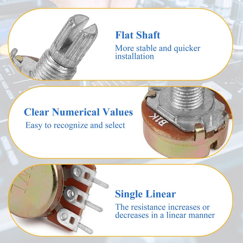 - Ready to use: the single-track potentiometer type B shows a linear relationship between resistance value and rotation angle. It is good for teaching/experiments and is used in audiovisual equipment, digital products, electronic toys, computer accessories, fitness equipment, car navigation, mixers, dimming products and more.