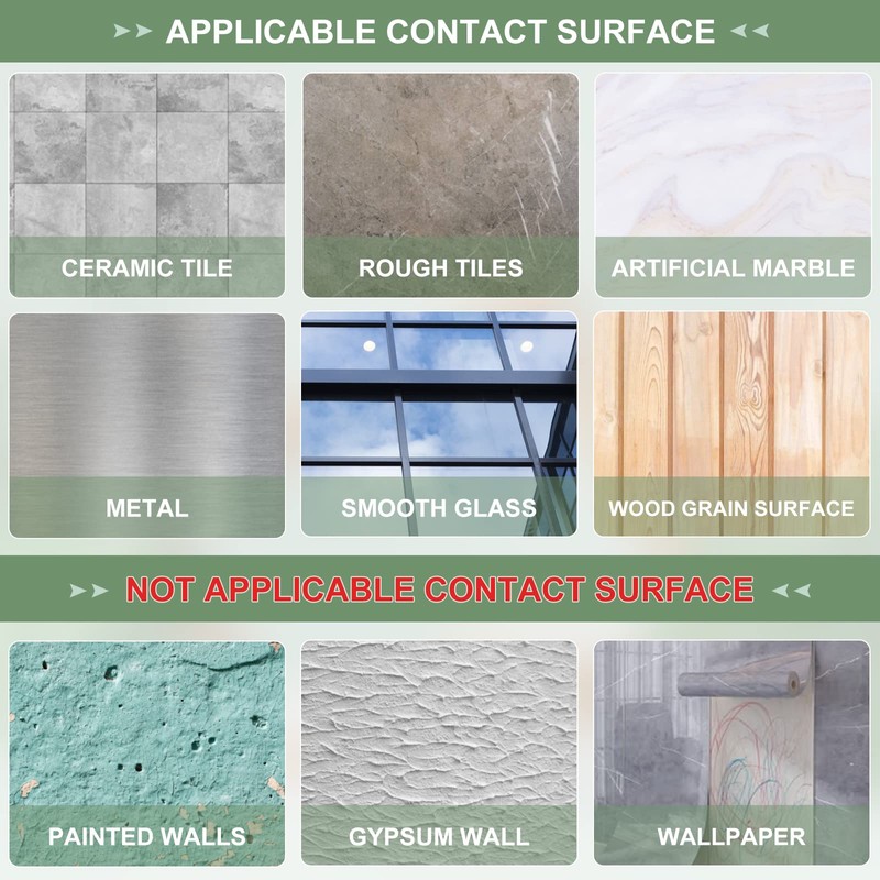 - Suitable surfaces: suitable for smooth surfaces such as tiles, glass, metal and marble. Not suitable for wallpaper, old stucco walls (see photos for more details).