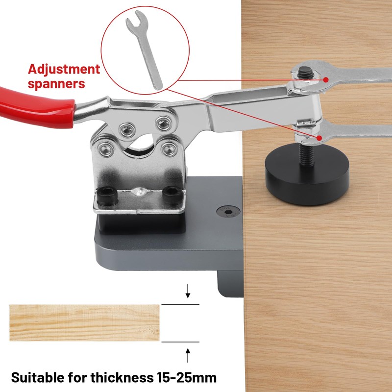 - Adjustable: Adjust the depth of the hole according to the depth of the hinge pot and tighten the depth stop. Adjust the black clamping pad according to the plate thickness. Place the hole punch in the indicated place on the plate and attach the quick clamp. Fix the drill and press down evenly until the depth stop moves, then drill the 2 mm screw holes on both sides.