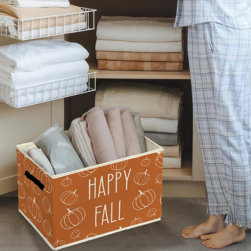 EGBTL Hello Fall Pumpkin Storage Bins & Boxes with Handles, Rustic Fall Foldable Basket for Organizing, Farmhouse Autumn Pumpkin Collapsible Laundry Hampers for Bedroom Bathroom Clothes Toys Books