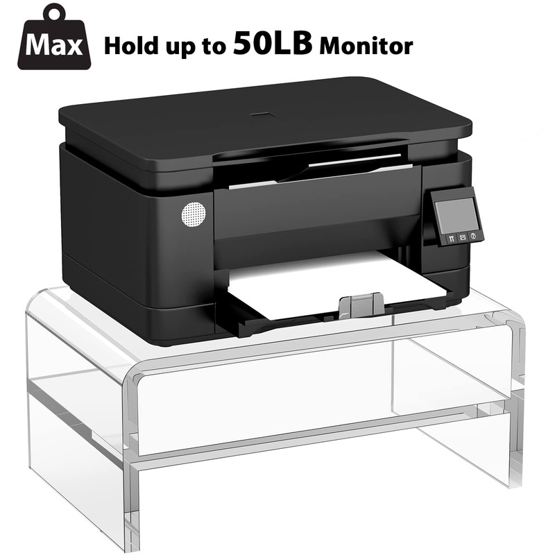 - 【MULTIFUNCTIONAL DESK ORGANIZERS AND STORAGE】The size of this acrylic monitor riser is 12 in (width) x 5.5 in (height) x 7.2 in (depth). The 2 tiers acrylic stand can be used as a computer monitor stand, printer stand, book or file shelf, and is a perfect desk organization accessory for home and office.