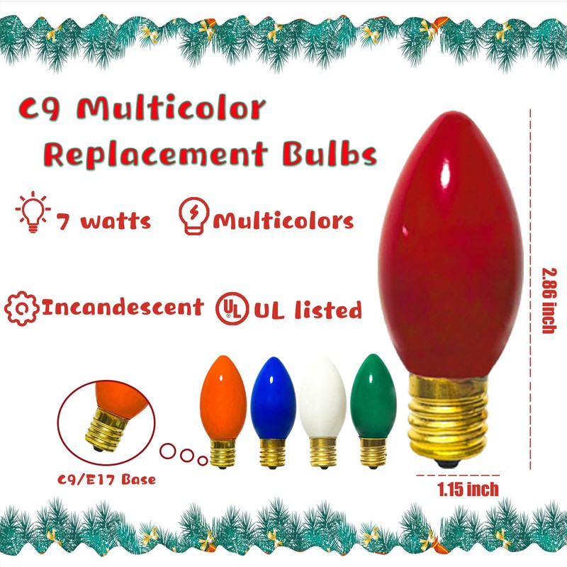 - 25 Pack C9 Christmas Light Replacement Bulbs: 25 pieces C9 multicolor replacement bulbs, Length: 2 15/16 inches Width: 1 1/8 inches, E17 base C9 christmas light bulbs ideal for Christmas trees, patios, and party decor, weddings, rooflines, or other outdoor spaces & events