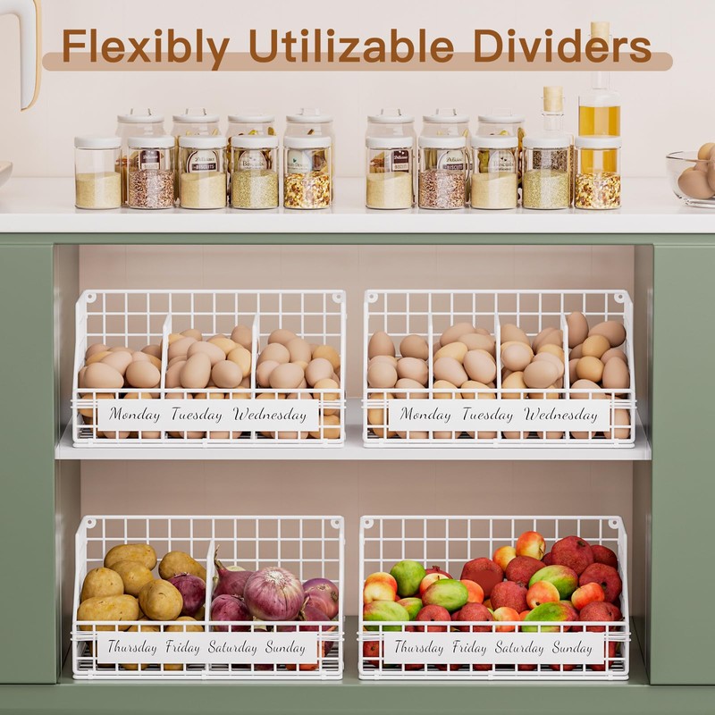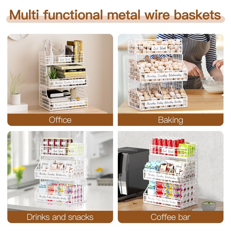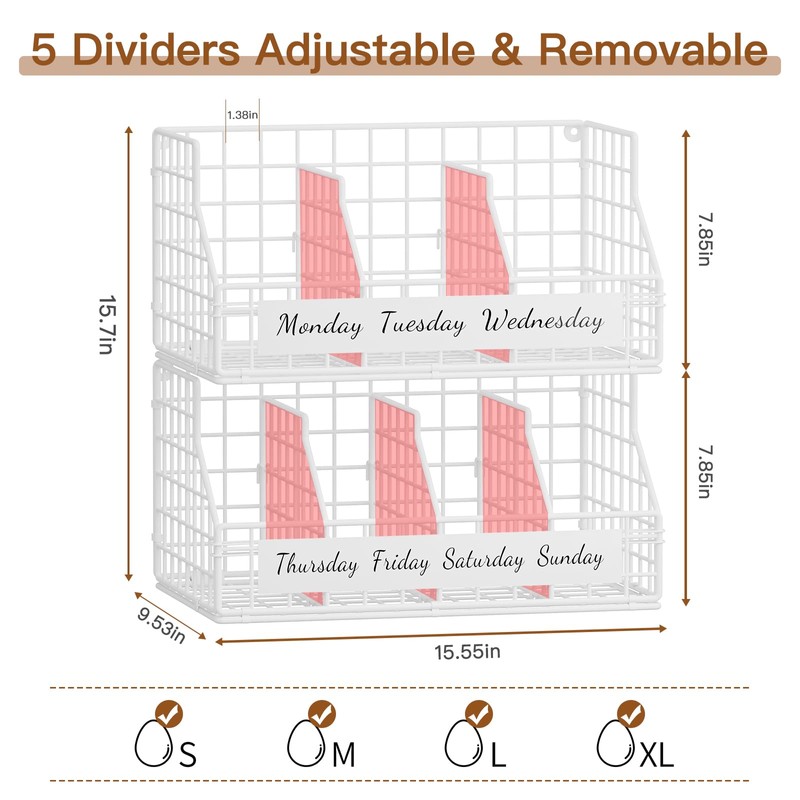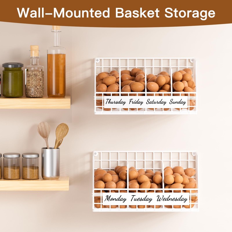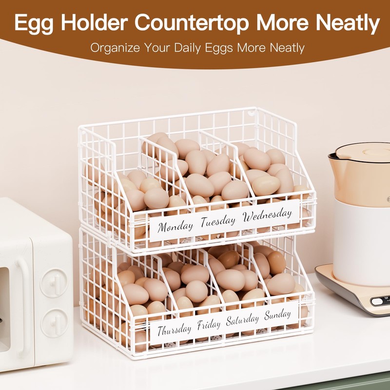 Upgrade your kitchen with this versatile egg holder countertop that offers customizable multi-tier storage, weekday labels, and wall-mounting capabilities for various organizational needs. Perfect for keeping your eggs neatly organized, this chicken egg basket weekday labels help track freshness, ensuring you use older eggs first. Families and meal preppers alike will appreciate the convenience of knowing exactly which eggs to grab. This egg holder is designed with stackable layers, allowing you to create a multi-tier storage solution based on your kitchen space or storage needs. You can start with a single tier and add more layers as needed, making it a flexible choice for both small and large households. Additionally, it can be mounted to the wall, freeing up valuable counter space and making it ideal for compact kitchens. Built from upgraded iron, this egg holder combines durability with style. Its sturdy construction ensures long-lasting use, while its sleek iron design adds a touch of rustic elegance to your kitchen. The adjustable dividers make it easy to customize each section, allowing you to store various egg sizes or other small kitchen items as needed. Whether on the countertop, wall-mounted, or used in a multi-layer setup, this egg storage for countertop offers maximum versatility and ease of use. Plus, the iron surface is simple to clean, ensuring your fresh egg holder remains hygienic and ready for daily use. Perfect for any kitchen, this egg organizer is a stylish and functional solution for modern homes.