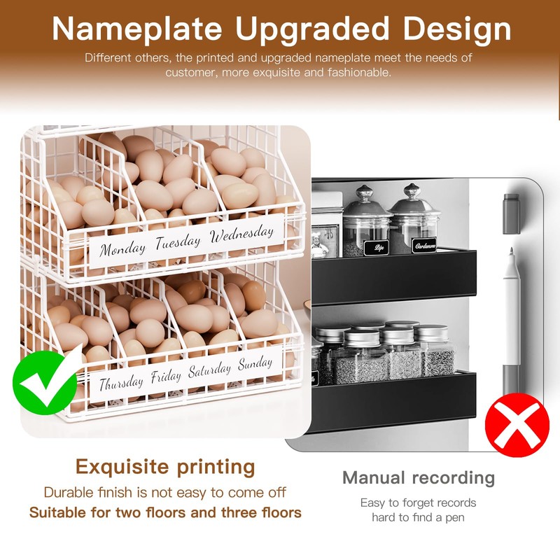 • Weekday Labels for Freshness Tracking: This egg holder countertop features labeled compartments for each weekday, making fresh egg holder countertop easy to track egg freshness. Great for egg storage who want to keep their egg organizer and know exactly which eggs to use first