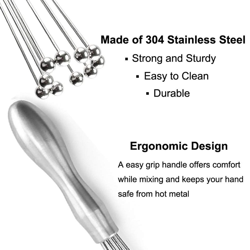 - 4. Great whisk for mixing beverage, creams, eggs, sauces and protein powders.