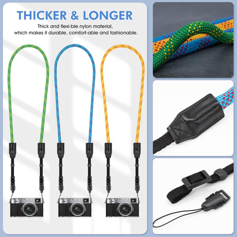 • 📷【Neck Shoulder Wrist】The basis for this great camera and binocular strap is a 100cm nylon climbing rope with a diameter of 11 mm ,still flexible but extremely durable.The minimalist design of the neck strap fits almost every type of camera and photographer.