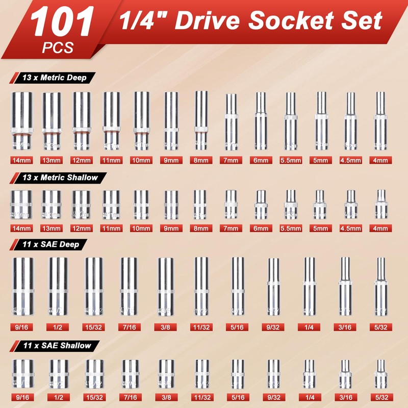 The 101 Pieces SAE/metric socket set 1/4 inch drive includes 26PCS shallow and deep metric socket: 4, 4.5, 5, 5.5, 6, 7, 8, 9, 10, 11, 12, 13, 14; 22PCS shallow and deep SAE socket: 5/32, 3/16, 7/32, 1/4, 9/32, 5/16, 11/32, 3/8, 7/16, 1/2, 9/16; 1PCS 1/4 72 teeth ratchet handle, 1PCS Spinner Handle, 2PCS extension bar: 3", 6"; 1PCS power drill adapter; 1PCS 1/4 360° universal joint; 1/4 bit adapter; 30PCS bits; 1/4 bit ratchet; 16PCS Metric and SAE allen wrenches. 6 Point 1/4" socket set is able to satisfy various maintenance demands of home improvement, car repair, vehicle repair and mechanism, other DIY projects. Made of heat treated Chrome Vanadium Steel, keeps durability and extreme torque strength. Clear size marks for easy identification.