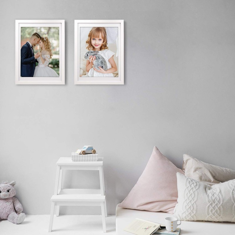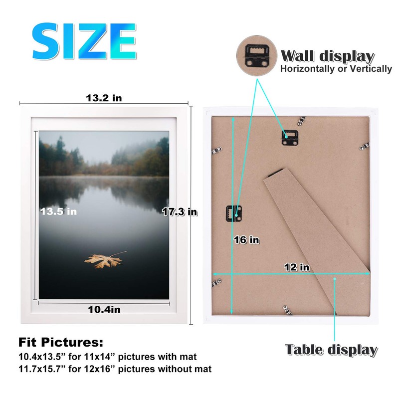 * 2 pack white 12x16 frames, fits 12x16 inch photo without mat or 11x14 inch with mat. * Comes with a mat: mat opening 10.4x13.5 inch for photo display. * White solid wood frames. * Hangs both for horizontal and vertical.