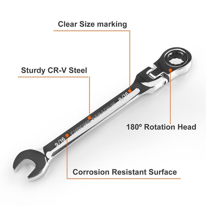 - Flex Head Design: 9/16 Inch wrench pivots 180° with 72-tooth gear wrenches need only 5-degree working swing arc for tight spaces working. Helping tighten the nut efficiently and laborsaving.