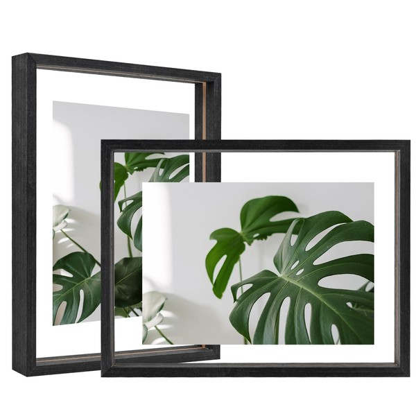 Egofine 9x12 Floating Frames Set of 2, Double Glass Picture Frame, Made of Solid Wood Display Any Size Photo up to 9x12, Wall Mount or Tabletop Standing, Rustic Black