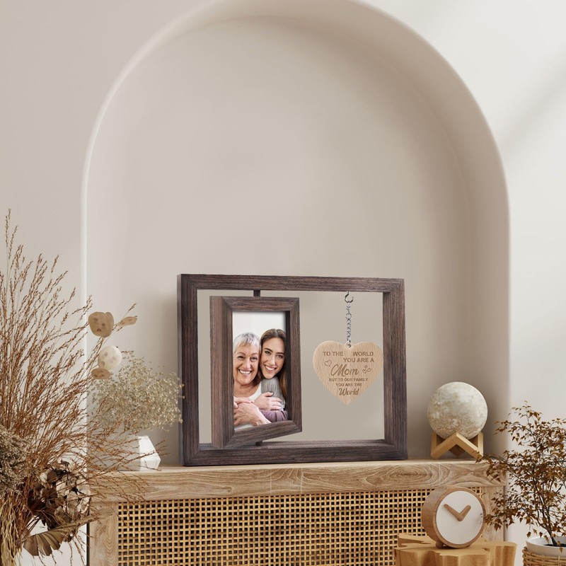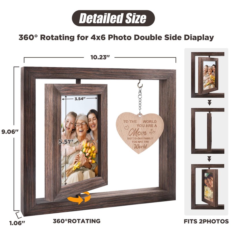 - Unique Design:Our 360-degree rotating frame is designed in rustic brown with natural wood grain. The outer frame size is 9.06x10.23x1.06, inner rotating photo frame measures 3.54x5.51" allow you insert two 4x6" pictures at the same time. Heart-shaped pendant with double sides sincere wishes, which will bring your unique regard to your mother.