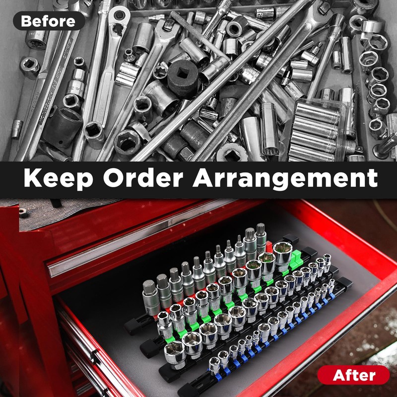 - Easy UsageAvailable in black, red, blue, and green, help quickly identify various sockets. Sockets can be firmly fixed on the socket tray only by press. The socket rails organizer can be neatly hung vertically or horizontally on the wall, workbench, or as draw and tool box socket organizer, which is the perfect choice for efficient tool organization.