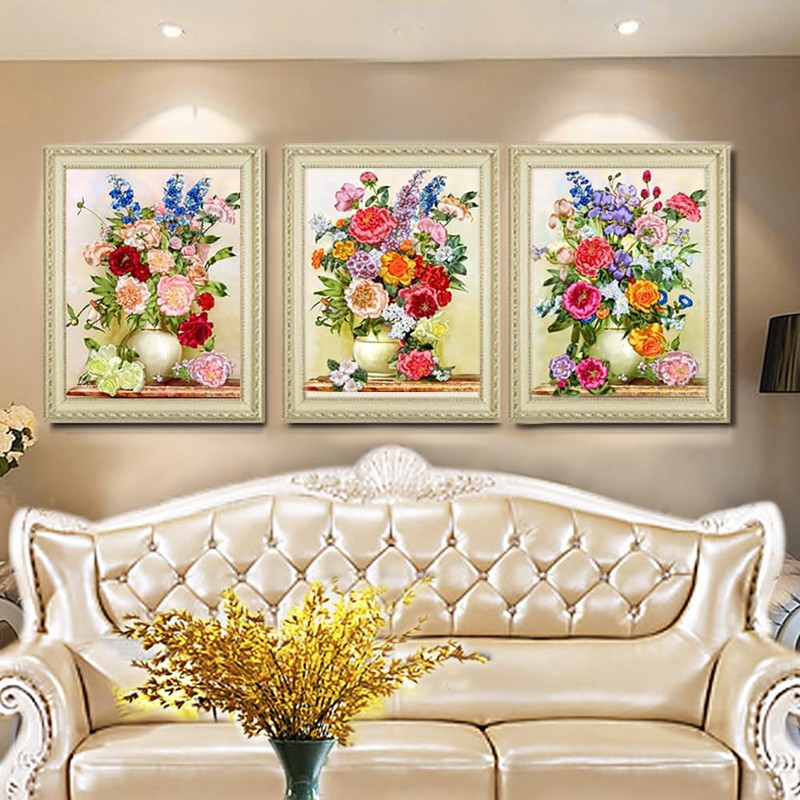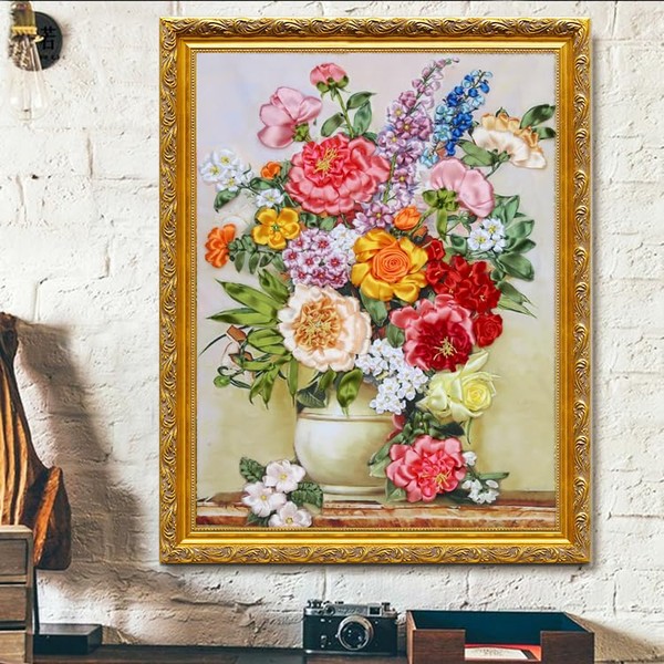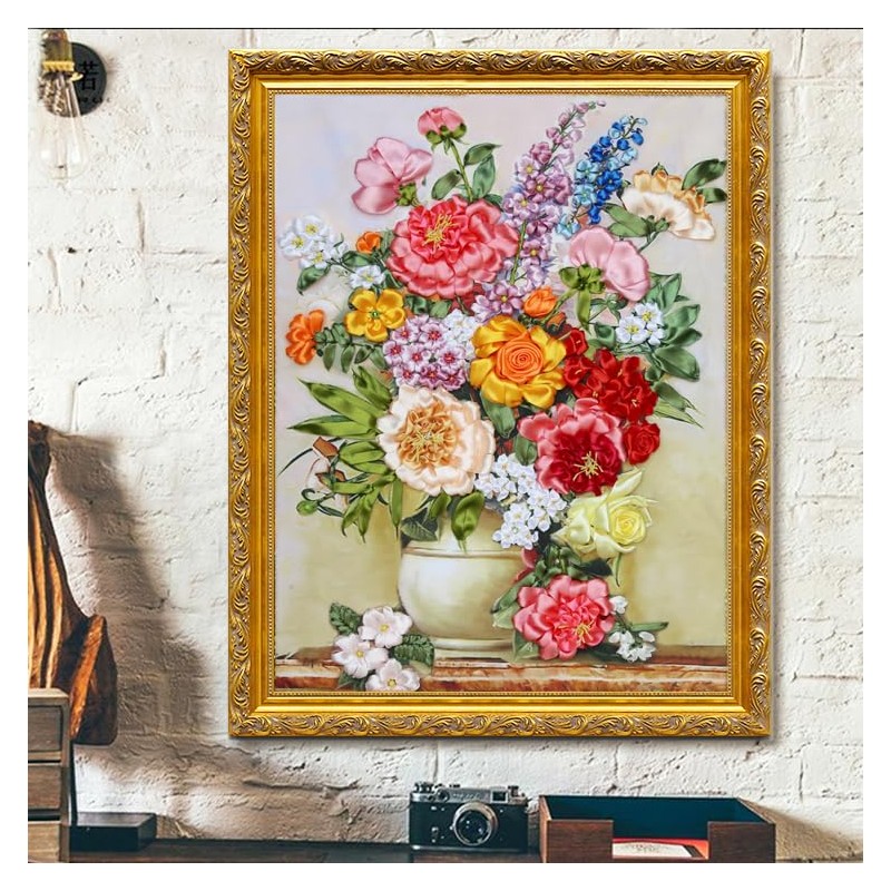 Egoshop Needle Work Ribbon Embroidery Blooming Flowers Kit DIY Wall Decor Stamp Canvas 3D Painting Not Include Frame (Blooming Flowers)