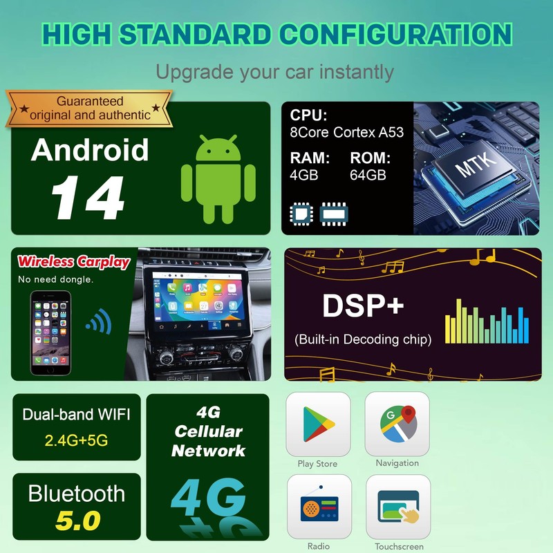 - [Support Wireless/Wired CarPlay & Android Auto] - Our system has already built-in an carplay app for Apple carplay and Android auto. Iphone and Android both enjoy this function. Completely Bluetooth connects!! No extra dongle or cable need.