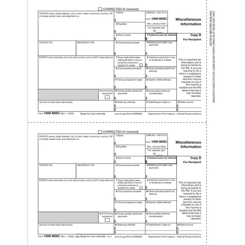 EGP 1099-MISC, Recipient Copy B, IRS Approved, Laser, Quantity 100 Forms/Recipients - 50 Sheets