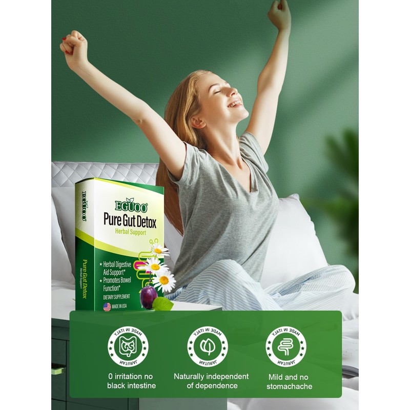 - Support Bloating and Constipation Relief - Combat bloating and discomfort by keeping your gut clean with EGUOO Pure Gut Detox, preventing gas build-up and ensuring smooth digestion for a more comfortable experience. Say goodbye to constipation with EGUOO Pure Gut Detox'gentle yet effective relief, encouraging regular bowel movements without discomfort or delay.