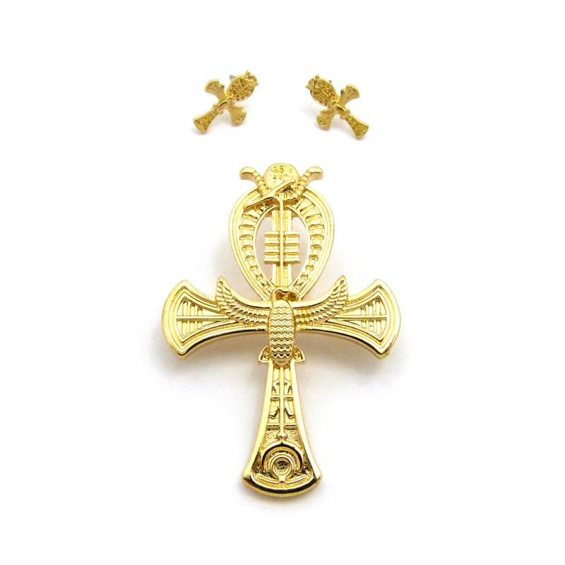 Egyptian Horus Bird, Maat, Nefertiti, Ankh Piece Brooches Pins Accessory & Pierced Earring Set in Gold Tone (Ankh Set)