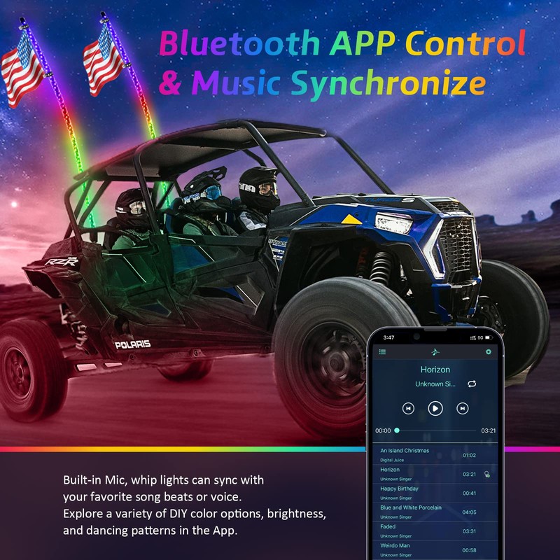 - 【Dual Control & Music Synchronize】Easily explore a variety of color, brightness, and pattern settings in the App or 24 keys remote. ATV LED whip lights will sync with your hit song beats from App or phone's mic. Immerse in the Rock music and color chasing lights whip. Enhance your offroad experience. (TIPS: Before using music sync function, set the sound sensitivity of external mic on App)
