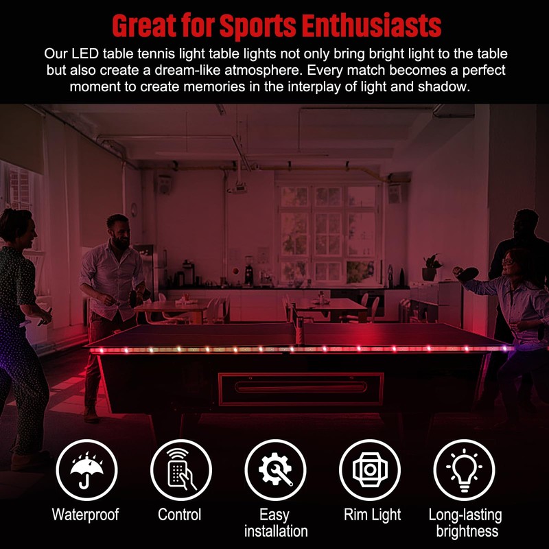 - Package Contents: Instantly transform your game night! You will receive a 4.3-meter/14-ft LED ping pong table light, equipped with 1 control, 1 battery box, 1 double-sided tape, and 5 zip-ties. This versatile light will instantly transform your ping-pong table into a fun and vibrant centerpiece, adding a joyful atmosphere for you and your family, whether at a family gathering or a club event!