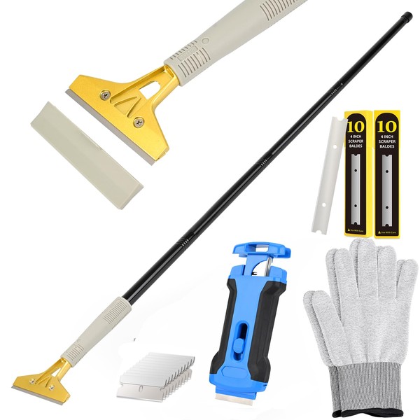 - Package contents: contain 1PC 15 inch- 58inch long handle 4" blade Glass Scraper with 20pcs 4 inch replace blades +1pc small handy metal cooktop scraper with 10pcs replace blades+ 1 Pair of gloves