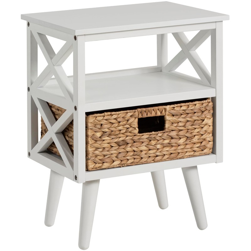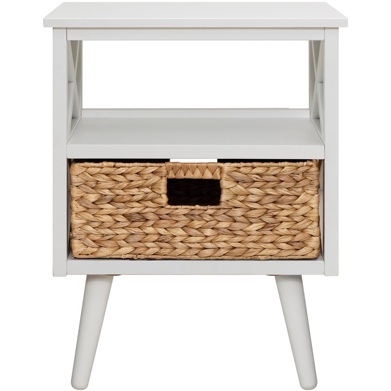 eHemco X-Side Mid-Century Nightstand End Table with Storage Shelf and Wicker Basket, White