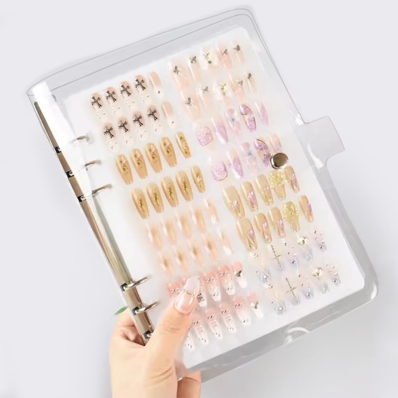 - VERSAILE & EASY TO USE: It not only neatly organizes your fake nails for easy access, freeing up desktop space to stay clean and tidy, but also keep press on nails from scratches and damage to maintain their nice appearance. Simply open the ring binder, take out the inside pages, paste the press on nails on them in an order manner, then place the sorted inside pages in the book format, close the ring binder and press the snap closure