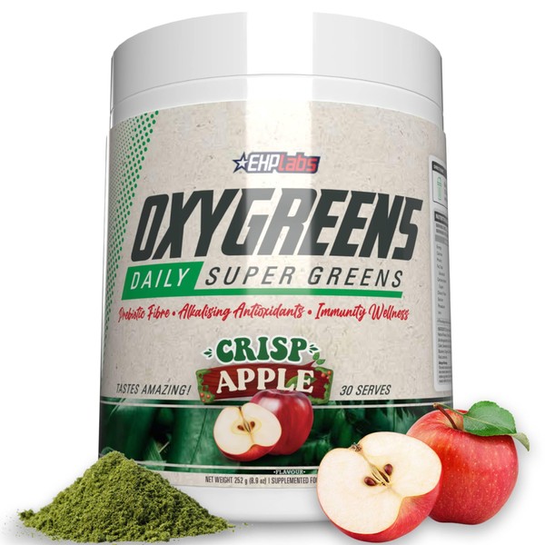 EHP Labs OxyGreens Daily Super Greens Powder - Green Superfood, Spirulina Herbal Supplement with Prebiotic Fibre, Alkalizing Forest Berries & Immunity Wellness Support, 30 Serves (Crisp Apple)