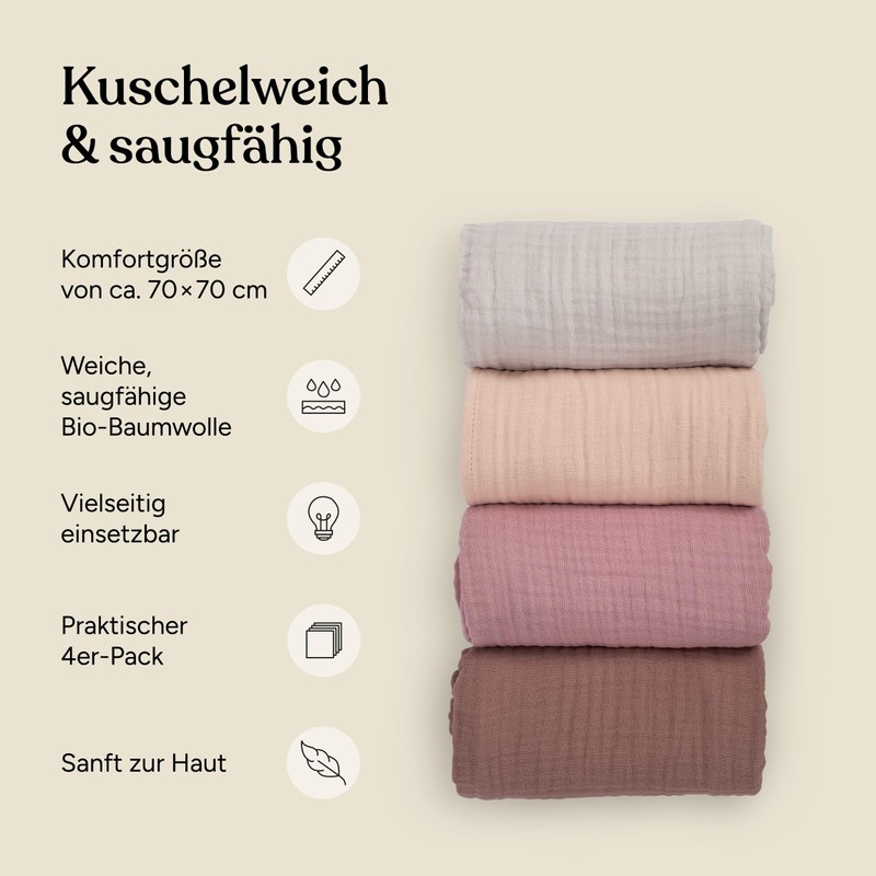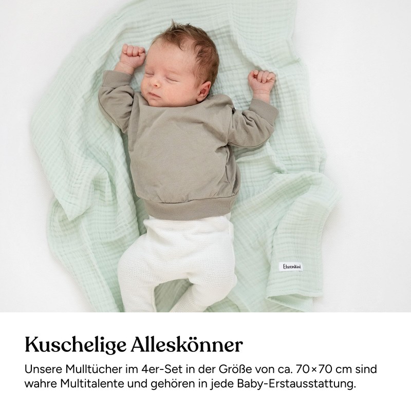 - Soft muslin cloths for baby's sensitive skin - Our Ehrenkind muslin cloths are extra gentle and skin-friendly, ideal as burp cloths for babies and indispensable baby accessories in baby's first equipment.