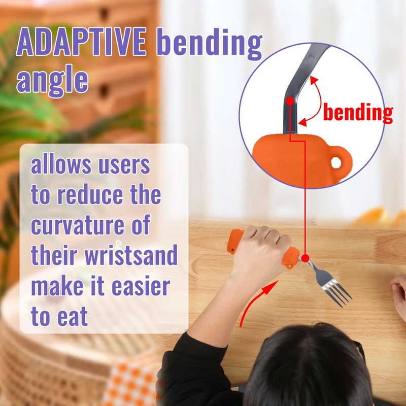 - Features of adaptive utensils : Ehucon adaptive utensil are curved in a perfect angle, texture design on the side of the handle of angle spoon increases the friction between users’ hands and the adaptive utensil, so that it is not easy to slip off during use.Big and easy to grip curved utensils of adaptive equipment .