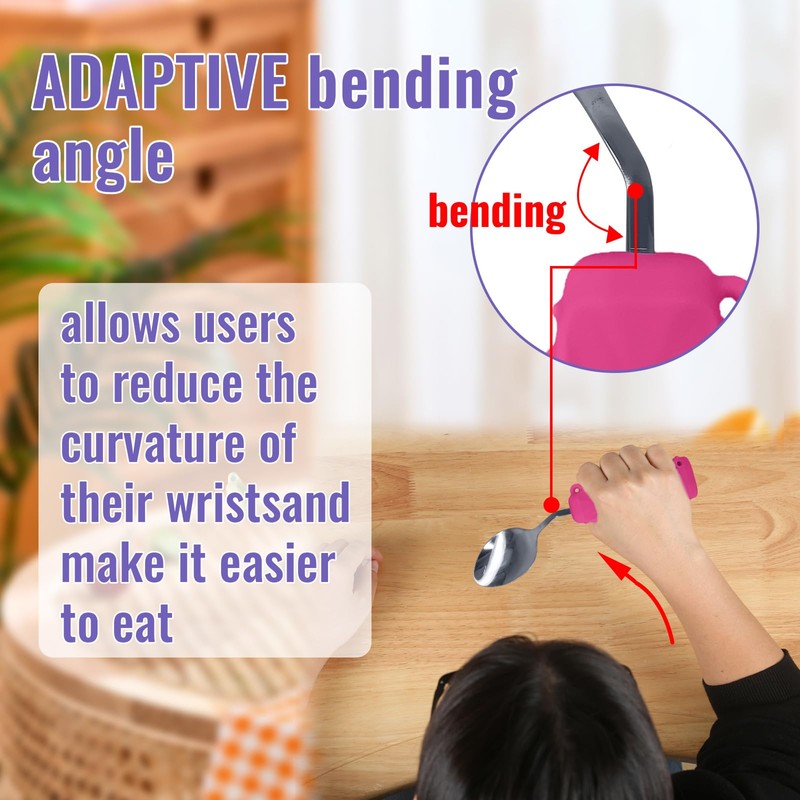 - Features of adaptive utensils : Ehucon adaptive utensil are curved in a perfect angle, texture design on the side of the handle of angle spoon increases the friction between users’ hands and the adaptive utensil, so that it is not easy to slip off during use.Big and easy to grip curved utensils of adaptive equipment .