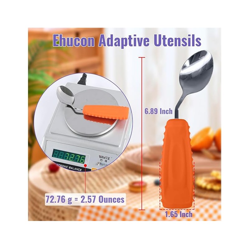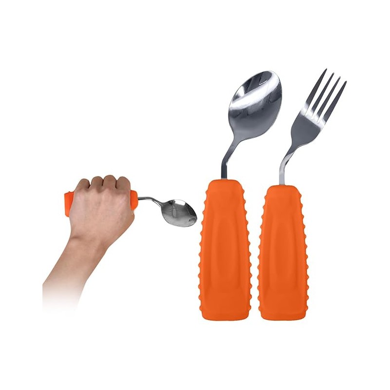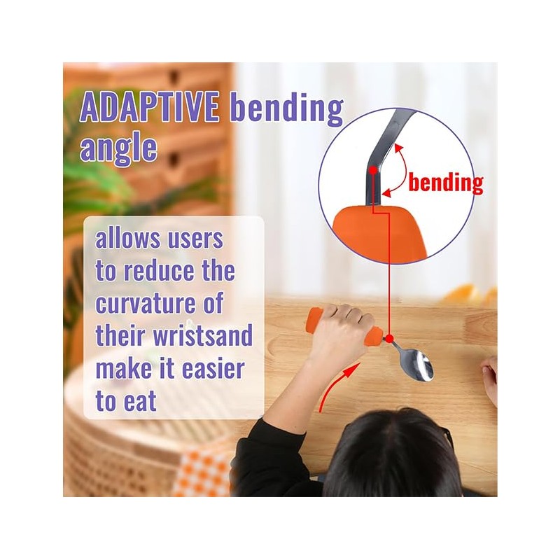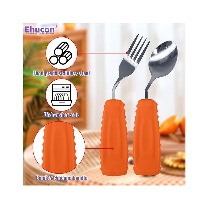 - 1.[Bending angle design]: Considering the actual needs of the elderly and Parkinson's patients, Ehucon adaptive eating utensils is bent to a specific angle that conforms to ergonomics, allowing patients with inflexible wrists to eat without bending their arms or turning their wrists, the adaptive silverware greatly helping them to eat independently.