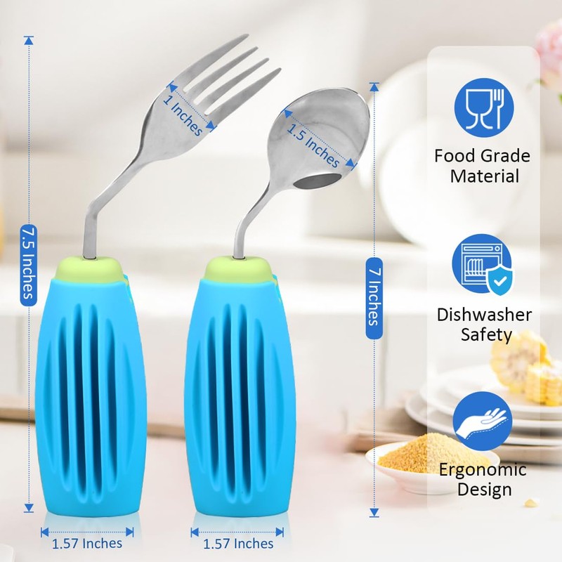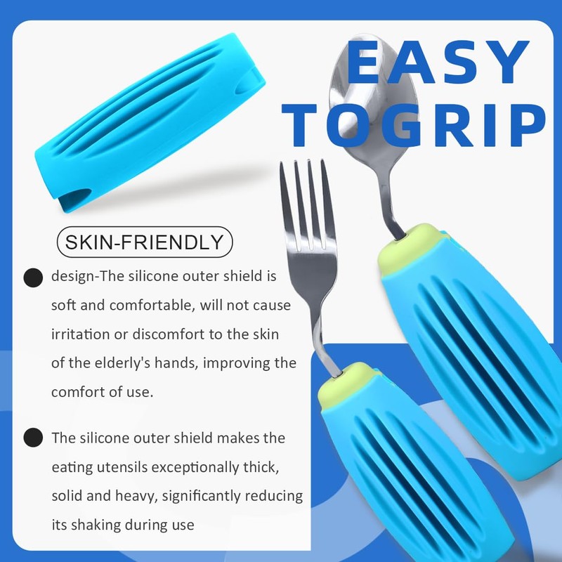 - About the silicone accessory: The silicone outer shield makes the eating utensils extra think and solid and weighted . Cylindrical body handle for easy grasp and more stable, and significantly reducing its shaking during use, allowing food to be delivered more accurately into the mouth, especially when hand strength is weak or during rehabilitation training.