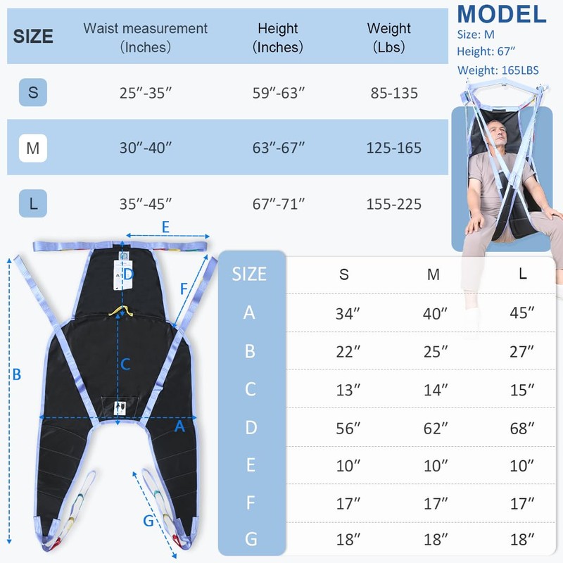 - Easy to Clean:The patient lift sling can be machine-washed at high temperatures up to 80°C (171°F), making the medical sling easy to clean and maintain. (Note: Please refer to the size chart to select the appropriate size.)
