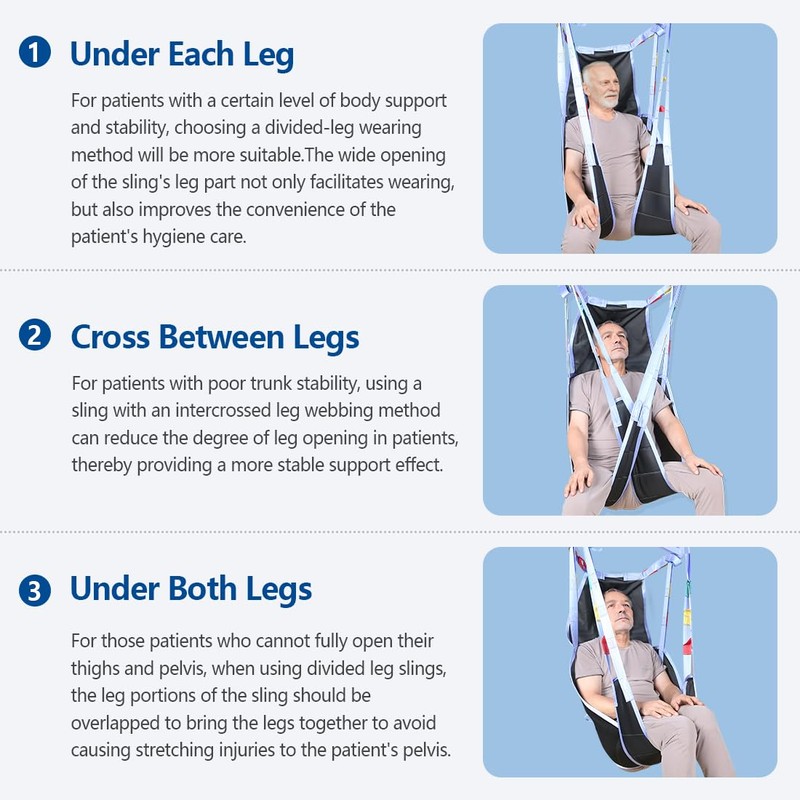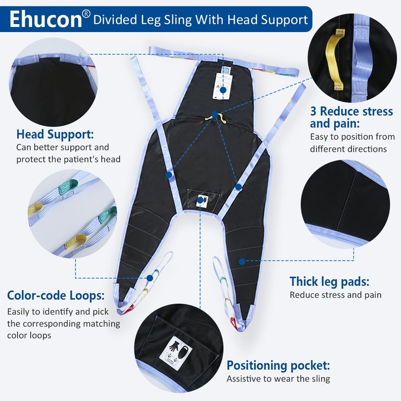 - Upgraded Head Support: For patients with limited head movement (those with neck injuries, paralysis or muscle weakness), we have upgraded this divided leg sling for patient lift with head support so that the patient lift sling can better support and protect the patient's head and patient can rest comfortably on the patient sling