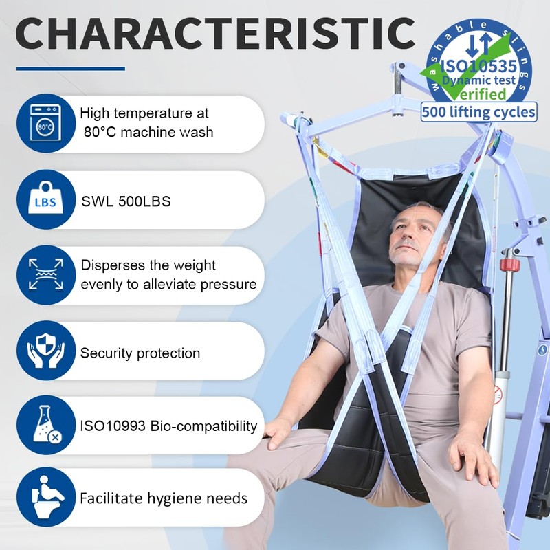 - Universal Compatibility and Durability (SWL 500 lbs):The medical lifting sling is compatible with most types of lifts. It has passed dynamic testing (500 pounds, over 500 lifting cycles) and static testing (750 pounds, for 20 minutes). Even after 10 washing cycles, it maintains its safe working load, good durability and meeting the needs for long-term use