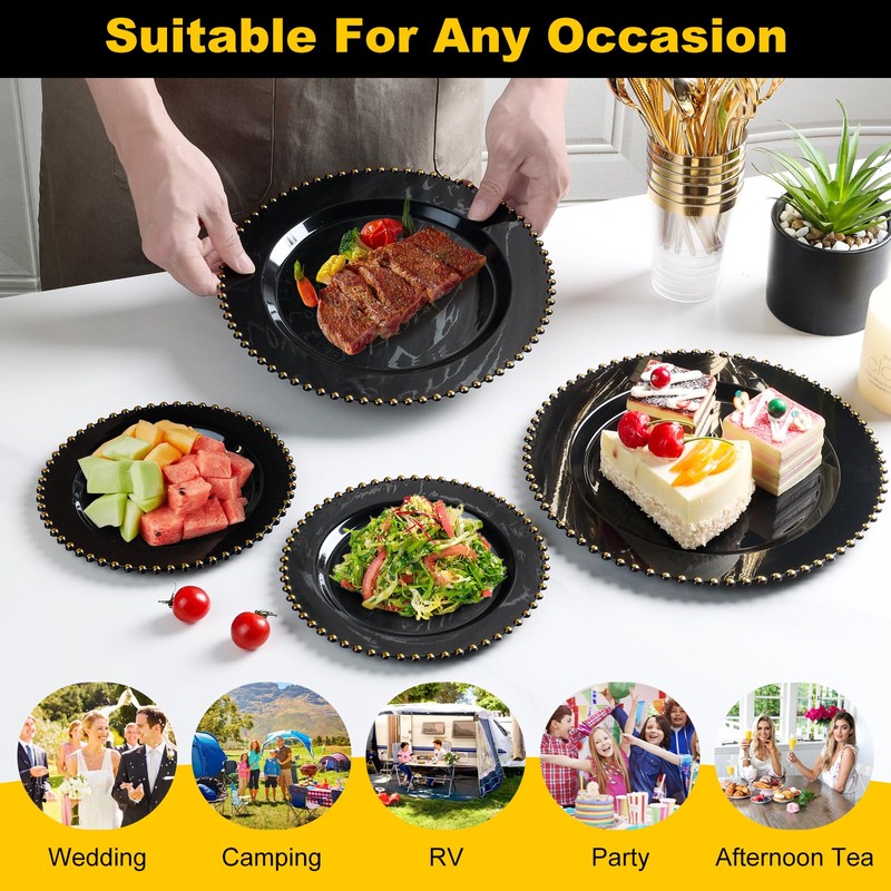 - Stunning & Unique Design: Make a bold statement at your next gathering with our exclusive black and gold plates. The sleek black base paired with luxurious gold accents creates a striking, sophisticated look, perfect for weddings, corporate events, or upscale dinner parties. Elevate your table setting with these eye - catching disposable plates.
