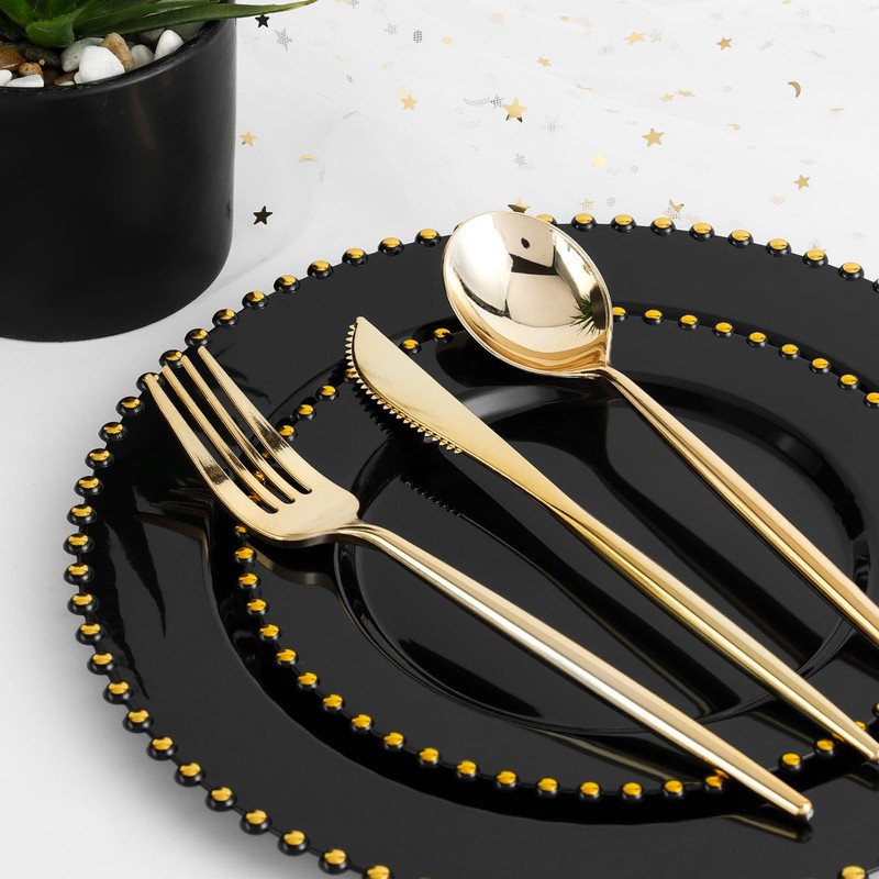 - Complete Black and Gold Party Set: Pair these black plastic plates with our Gold Plastic Silverware to create a cohesive, elegant look. Part of our Black and Gold Plastic Dinnerware Set, these heavy - duty pieces can hold generous servings of food without bending or leaking, ensuring a mess - free and memorable dining experience at every party.