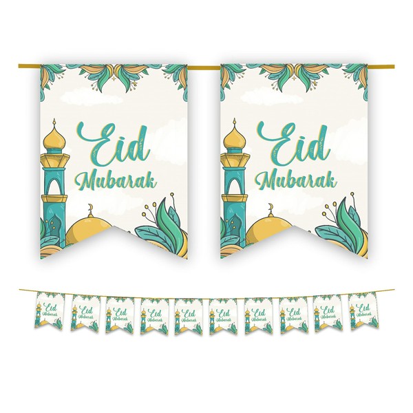 Eid Mubarak Bunting Party Flags - 10 Flags - Eid Decorations (Green & Gold)