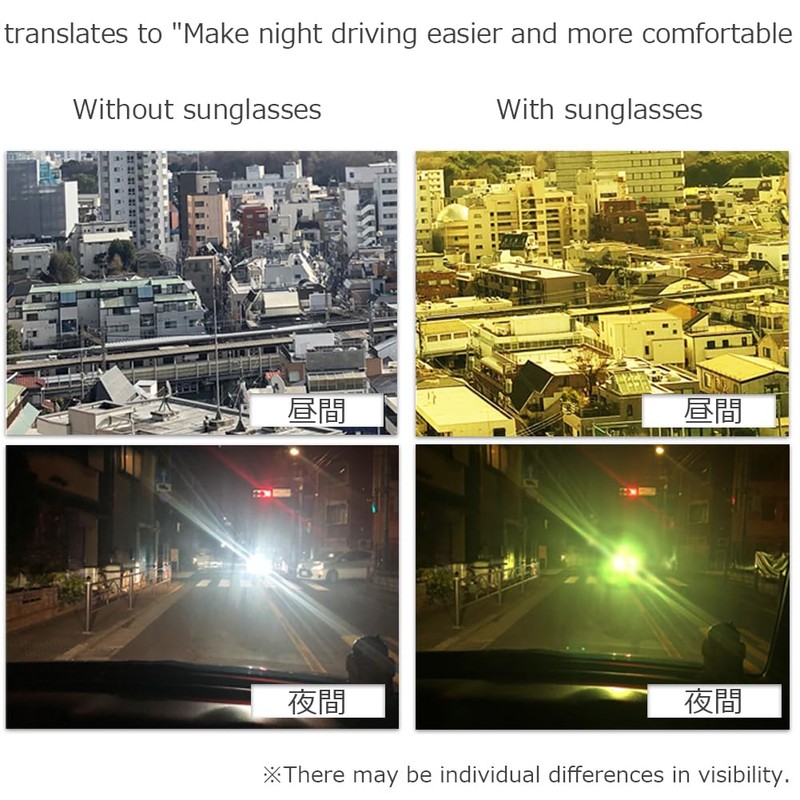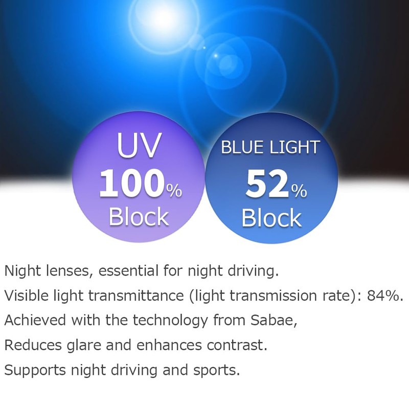 - Equipped with Japanese high-performance night lenses, our eyewear reduces glare, enhances contrast for clear vision, and supports nighttime driving and sports. The thin lenses prevent eye fatigue even during long drives, with 99.9% UV protection, 52% blue light reduction, and 84% visible light transmission.